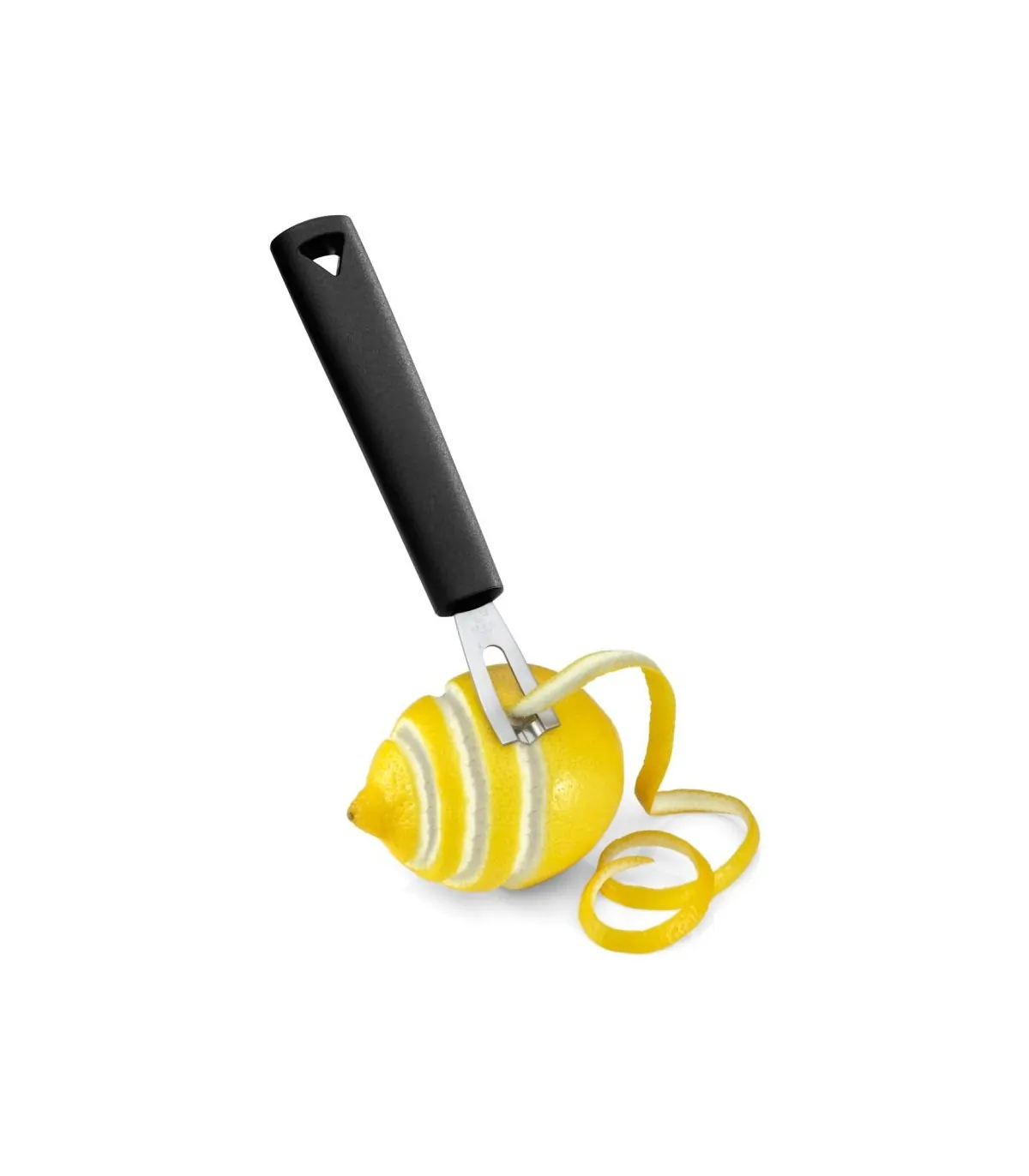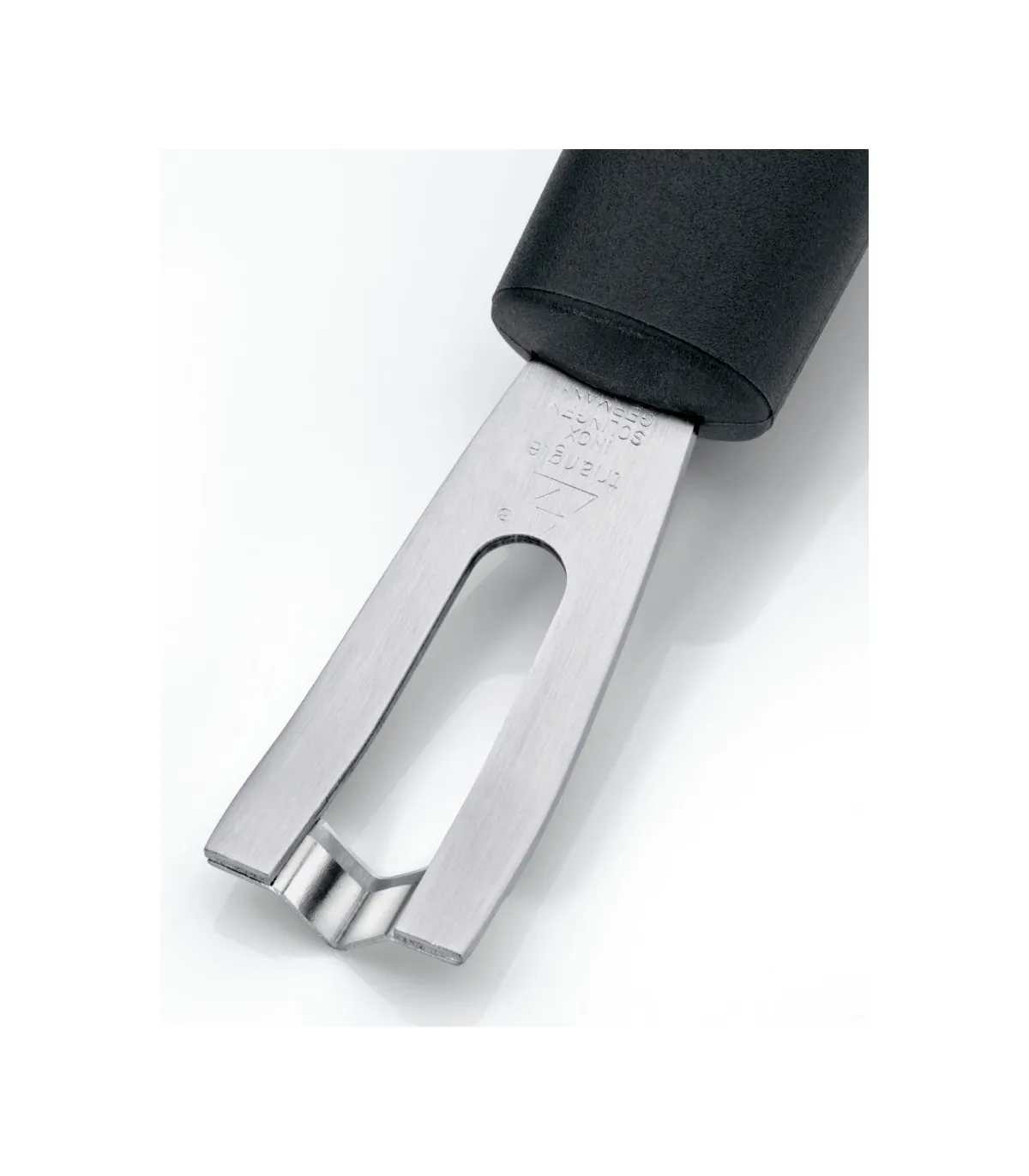 Το μαχαίρι αυλακώσεων με τρίγωνη οπή είναι ένα κλασικό εργαλείο για το μπαρ σε μια νέα και βελτιωμένη έκδοση. Η εγκοπή πλάτους 6 mm κόβει βαθιά την επιφάνεια των φρούτων και λαχανικών δημιουργώντας κορδέλες και εγκοπές. Το σταθερό βάθος διείσδυσης το καθιστά πολύ εύκολο στη χρήση. Η λεπίδα είναι κατασκευασμένη από ακονισμένο ανοξείδωτο ατσάλι, που παραμένει ανθεκτικά κοφτερή.