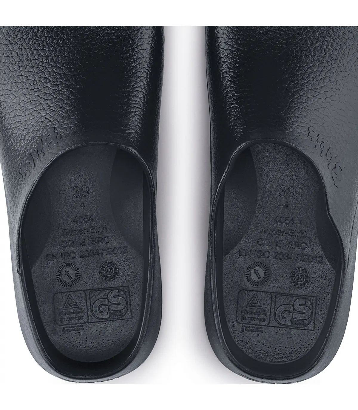 Η μεγάλη ποικιλία χρωμάτων που διατίθεται στο Super Birki το καθιστά εξαιρετικά ευέλικτο για χρήση σε όλα τα είδη επαγγελματικών και ιδιωτικών ρυθμίσεων. Αυτό το συμπαγές παπούτσι κατασκευασμένο από αδιάβροχη και αυτοκαθαριζόμενη πολυουρεθάνη είναι επίσης ανθεκτικό σε λάδια και γράσα. Αυτό το εξαιρετικά ανθεκτικό υλικό πλένεται στους 80 ° Κελσίου και μπορεί να απολυμανθεί αποτελεσματικά. Η ανθεκτικότητα και οι ιδιότητες υγιεινής του το καθιστούν ιδανικό για κουζίνες, ιατρικά περιβάλλοντα και τη βιομηχανία τροφίμων - ενώ μπορεί επίσης να χρησιμεύσει ως πρακτικό σαμπό για τον κήπο. Το ανατομικό πέλμα από φελλό-λατέξ είναι μπορεί να αφαιρεθεί για εύκολο καθάρισμα και πλένεται στους 30 ° Κελσίου. Όλα τα μοντέλα Super Birki είναι πιστοποιημένα σύμφωνα με το πρότυπο EN ISO 20347: 2012 OB E (κατηγορία SRC).