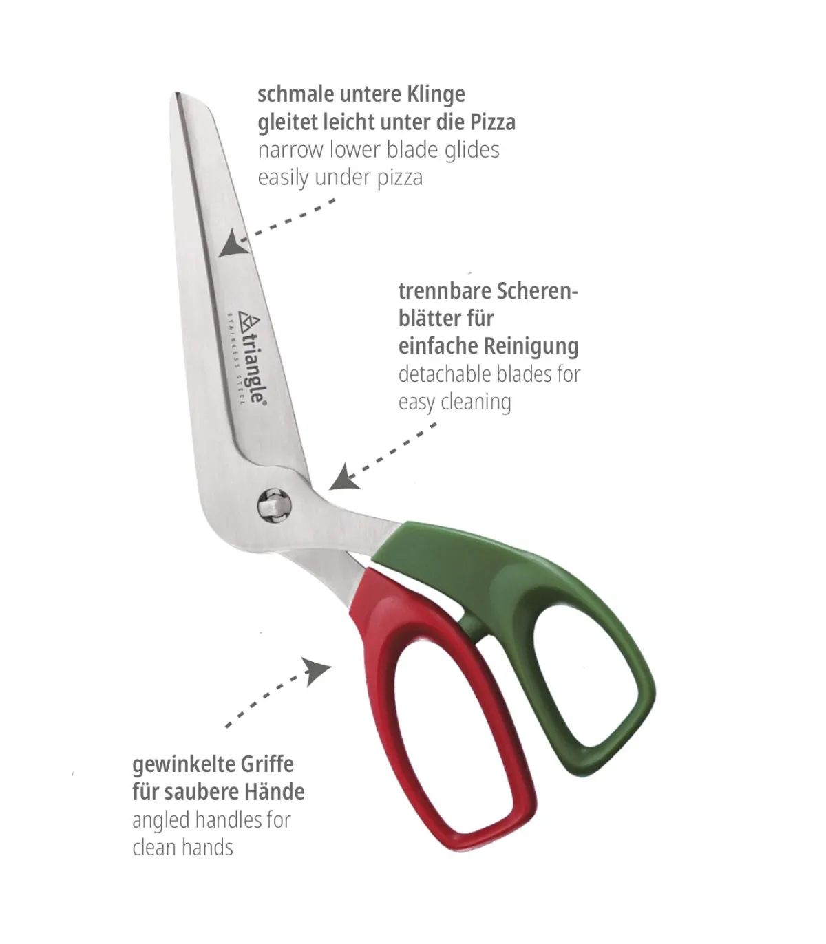 Το ψαλίδι πίτσας της triangle κόβει την πίτσα καθαρά και εύκολα χωρίς να μετακινεί το τυρί ή να καταστρέφει τον δίσκο. Είναι λειτουργικό και εύκολο στο πλύσιμο, αφού οι δύο λεπίδες του διαχωρίζονται.